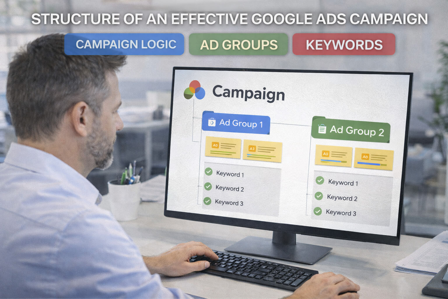 Структура ефективної кампанії в Google Ads передбачає не лише правильний поділ ключових слів, а й адаптацію текстів оголошень під кожен намір.