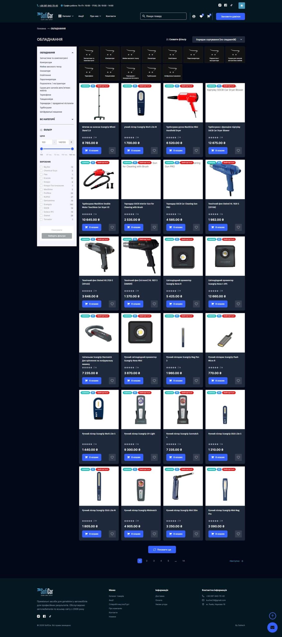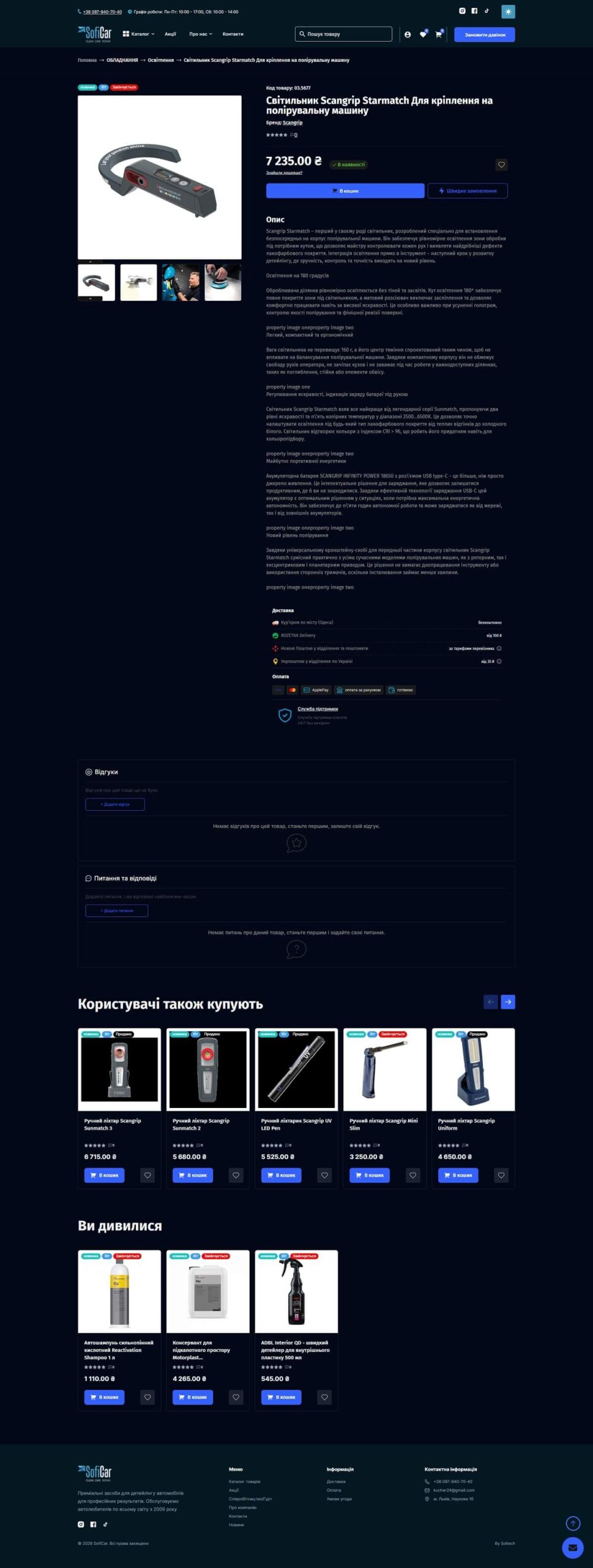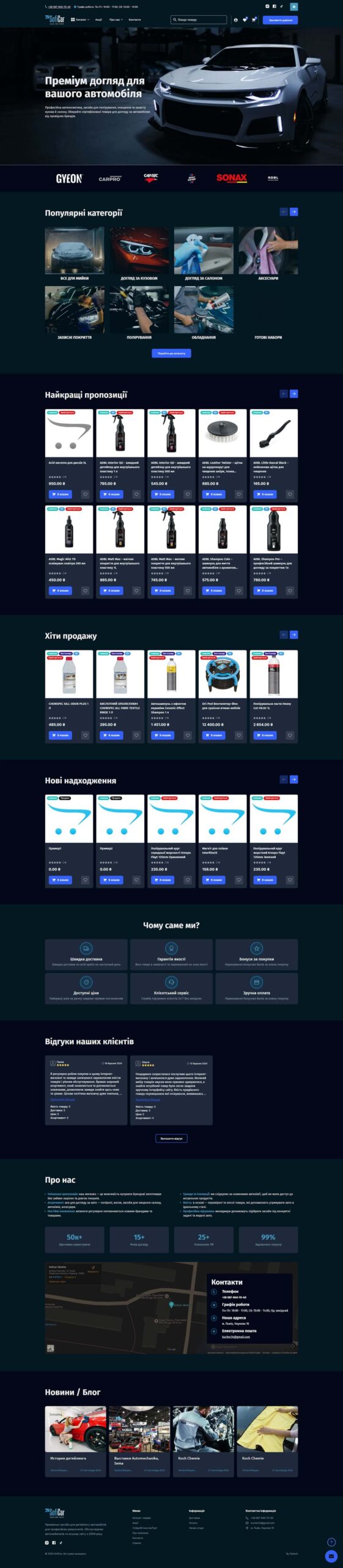 Розроблено сайт із логічною структурою товарних категорій, які охоплюють найрізноманітніші потреби в догляді за авто: від очищення кузова, скла та шин до засобів для хімчистки салону, поліролей, квік-детейлерів та аксесуарів для догляду. Дизайн витримано в сучасній стилістиці й доповнено зручними фільтрами та розділами, що допомагають швидко переходити між групами товарів.