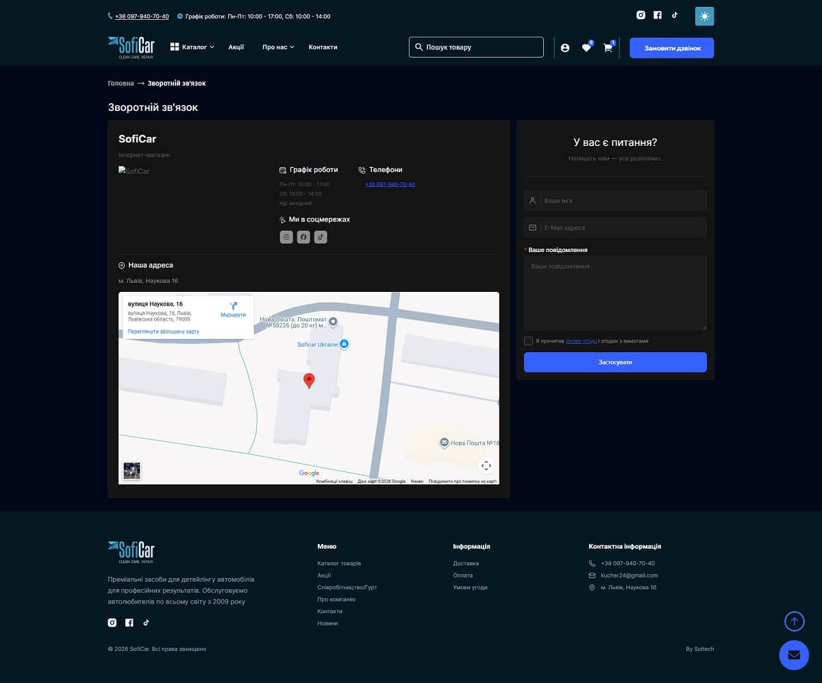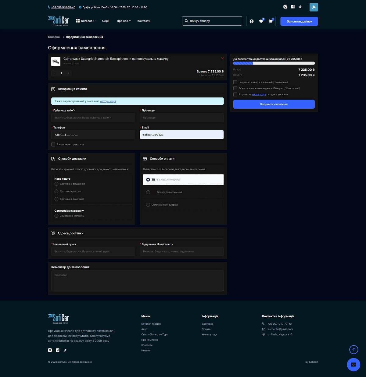 Сайт soficar.com.ua став зручним інтернет-ресурсом для тих, хто цінує якісний догляд за своїм автомобілем. Завдяки продуманій структурі та широкому вибору продукції покупці можуть легко знайти потрібні засоби та аксесуари, отримати інформацію про умови покупки та оформити замовлення. Платформа сприяє підвищенню довіри клієнтів і покращенню сервісу в сегменті професійної автокосметики.